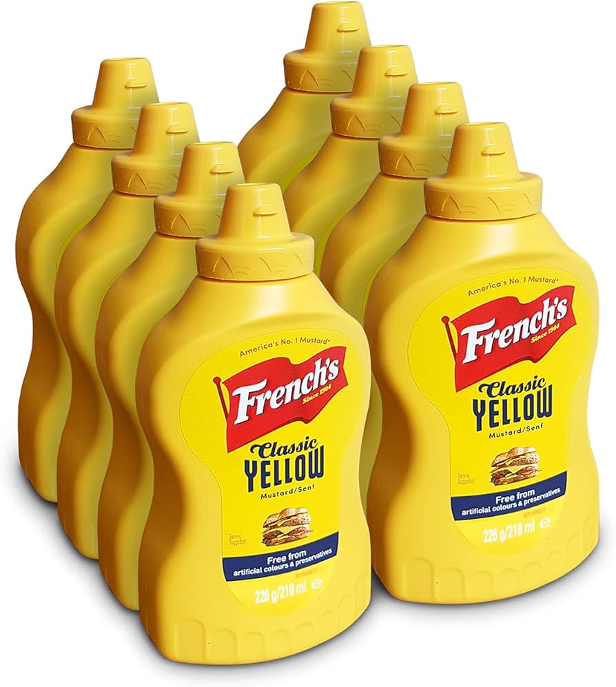 French’s American Classic Mustard 226g contains distilled vinegar, water, #1 grade mustard seed (14%), salt, turmeric, paprika, spices, natural flavor, and garlic powder. It contains mustard and does not contain common allergens such as milk, eggs, fish, crustaceans, molluscs, soybeans, sesame, nuts, peanuts, lupin, cereals containing gluten, or sulphites. It is suitable for vegetarian, vegan, and kosher diets.