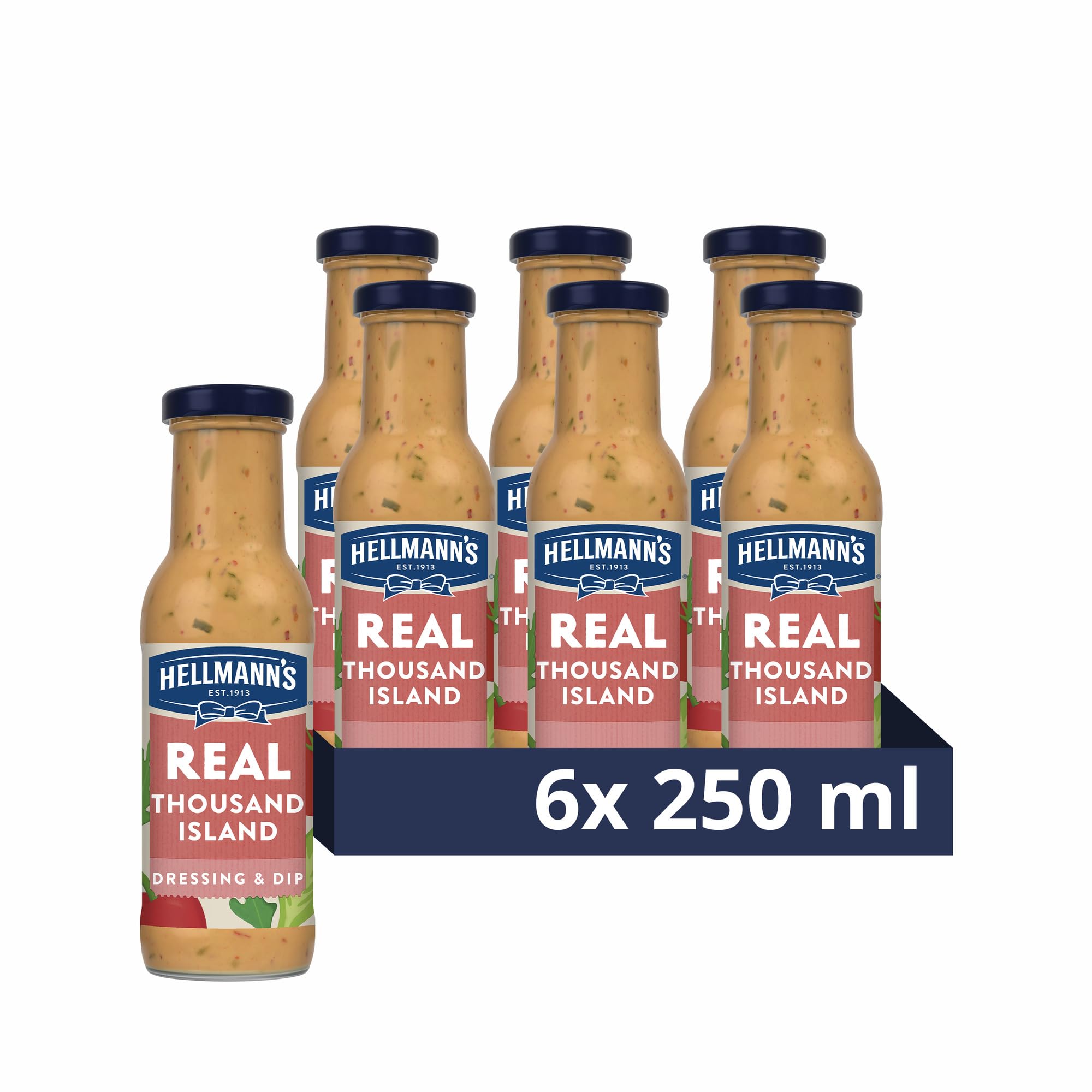 Hellmann’s Real Thousand Island Salad Dressing & Dip (250ml) is a creamy and tangy condiment crafted with real ingredients like red pepper and tomato. This versatile dressing is free from artificial colours and flavours, making it a wholesome choice for enhancing your meals. Whether drizzled over crisp salads, used as a dip for crunchy vegetables, or added to sandwiches and wraps, it adds a delightful burst of flavour. Its rich texture and balanced taste make it a popular choice for those seeking a natural and delicious addition to their dishes.