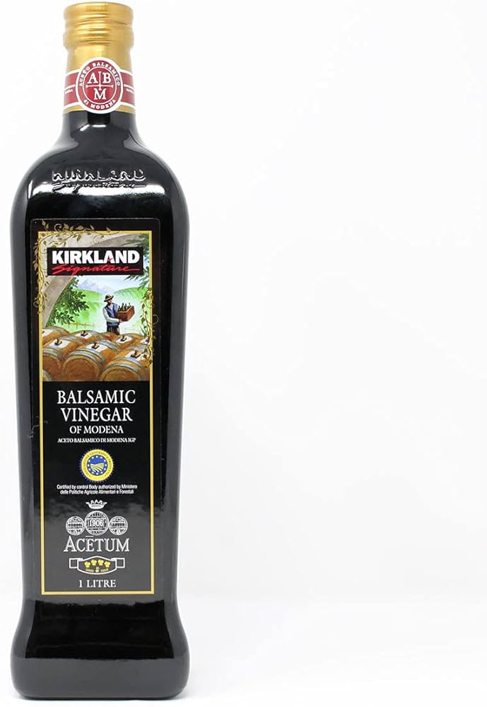 Kirkland Signature 4 Leaf Balsamic Vinegar of Modena (1L) is a premium, authentic Italian vinegar crafted in the heart of Modena, Italy—the birthplace of traditional balsamic vinegar. Produced using a centuries-old recipe, it is matured in wooden casks to develop a rich, balanced flavor profile. The vinegar undergoes a meticulous aging process to achieve the perfect balance of sweetness and acidity, resulting in a smooth and luscious flavor. This vinegar is rated Four Leaves, the highest quality grade awarded by the Assaggiatori Italiano Balsamico (AIB), reflecting its superior taste and craftsmanship.With an acidity of 6%, Kirkland Signature Balsamic Vinegar is versatile in the kitchen. It enhances salads, marinades, glazes, and can be drizzled over fruits or cheeses. The 1-liter bottle size makes it ideal for both everyday use and entertaining guests. Additionally, it is fat-free, low in sugar, gluten-free, and non-GMO, catering to a variety of dietary preferences.