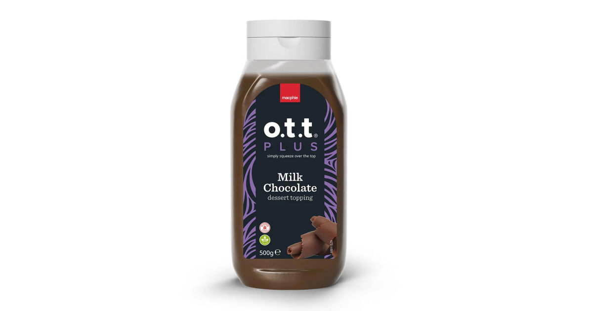 Macphie Ott+ Milk Chocolate Dessert Topping 500gA smooth, indulgent dessert topping made with rich milk chocolate, offering a creamy and sweet chocolate flavour. It is versatile and can be used as a sauce over ice cream, profiteroles, pancakes, or waffles, and can also be drizzled onto cakes and pastries. Its silky texture and classic milk chocolate taste make it a popular choice for chocolate lovers.