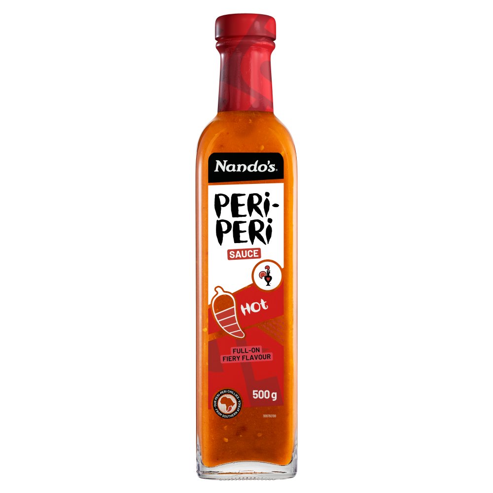 Nando’s Hot Peri-Peri Sauce (500g) is a fiery condiment crafted from a blend of African Bird’s Eye chillies, sun-ripened lemons, onions, and garlic. This sauce delivers a bold, tangy heat that enhances a variety of dishes, including grilled meats, vegetables, and sandwiches. Its vibrant red hue and spicy kick make it a favorite among those who enjoy intense flavors.