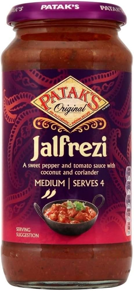 Patak’s Jalfrezi Cooking Sauce (450g) offers a vibrant and flavorful medium-spiced curry experience, inspired by the traditional Bengali dish. This sauce combines ripe tomatoes, red and green peppers, and a blend of aromatic spices such as coriander and cumin. The addition of desiccated coconut adds a subtle richness, while garlic and ginger purées contribute depth and warmth to the dish. Designed for convenience, it allows you to prepare an authentic-tasting Jalfrezi curry at home by simply adding your choice of meat, seafood, or vegetables. Patak’s Jalfrezi Cooking Sauce is gluten-free, contains no artificial colors, flavors, or preservatives, and is suitable for vegetarians and vegans. With a medium heat level, it provides a balanced and satisfying curry experience. Whether you’re cooking for a weeknight meal or entertaining guests, this sauce delivers a delicious and authentic curry with minimal effort.