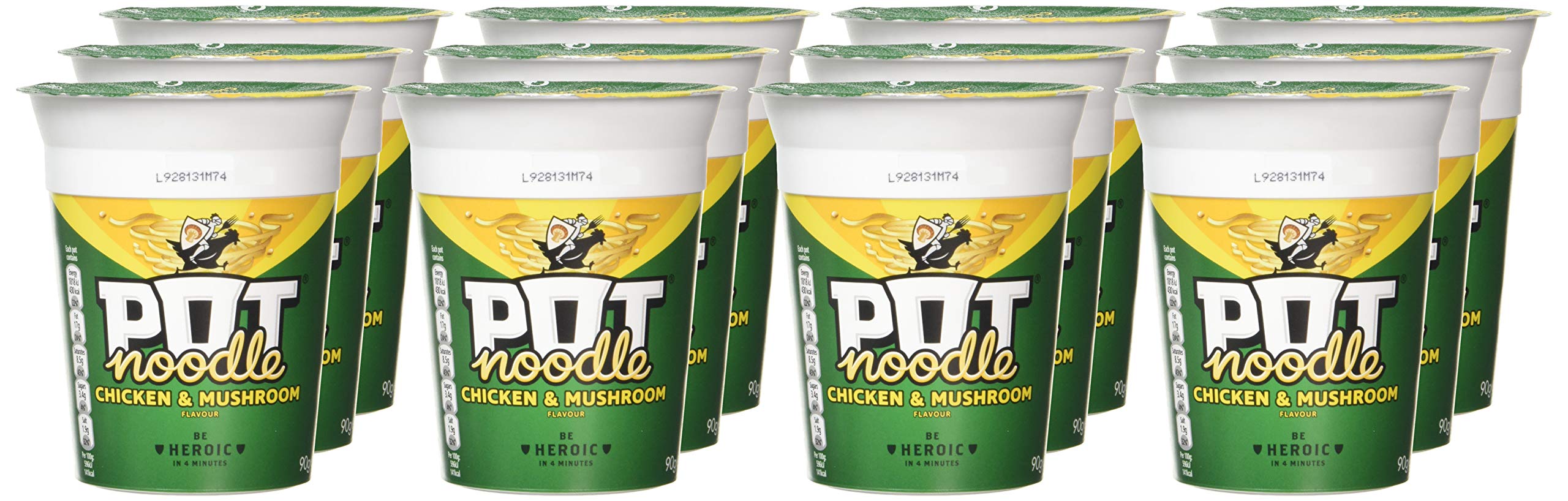 Pot Noodle Chicken & Mushroom Flavour, 12 x 90gThis family pack of Pot Noodle Chicken & Mushroom contains twelve pots of the brand’s classic recipe. Each pot has soft noodles in a creamy chicken and mushroom flavoured sauce, enhanced with onion, herbs, and soy sauce. It is one of Pot Noodle’s most popular varieties, offering a balanced mix of savoury and mild flavours.