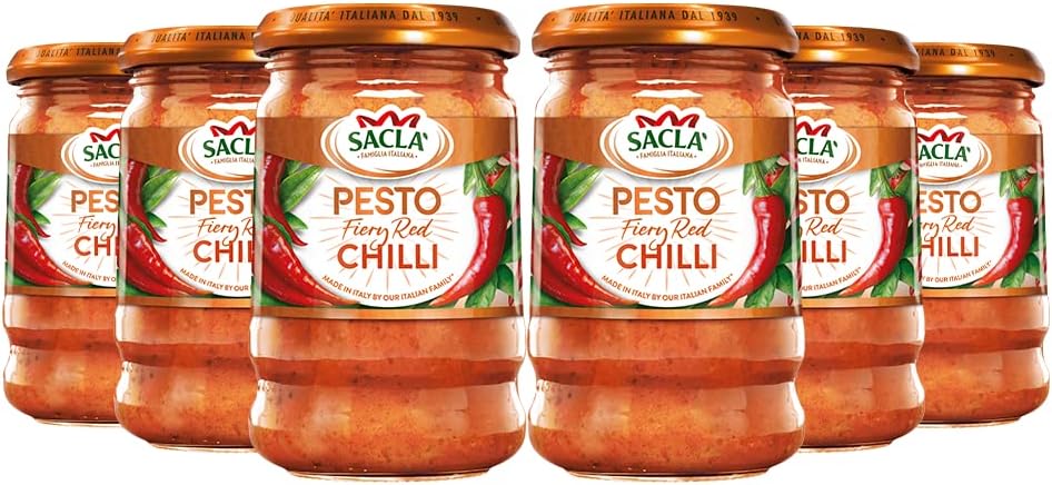 Sacla’ Fiery Chilli Pesto 190g is an intense and flavorful condiment that brings a bold kick to your dishes. Crafted with a blend of red peppers (30%), tomato paste, sunflower seed oil, parsley, almonds, medium-fat hard cheese (milk), garlic, dried and sliced chili pepper (1.7%), red pepper flakes, salt, rice syrup, acidity regulator (lactic acid), black pepper, thyme powder, and aniseed, this pesto offers a harmonious balance of heat and depth. Made in Italy by Sacla, a brand renowned for its authentic Italian recipes, this pesto is suitable for vegetarians and can be used to spice up pasta, roasted vegetables, grilled meats, or as a dip. Its rich, spicy flavor profile makes it a versatile addition to various cuisines, adding a fiery touch to your meals.